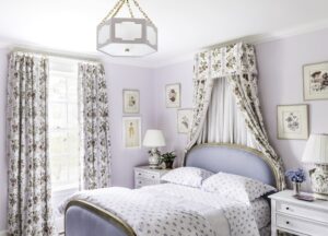 lilac-lavender-walls-paint-bedroom-cece-barfield-thompson-bed-hanging-upholstered-headboard-pleated-lampshade-raoul-textiles-drapery-curtains