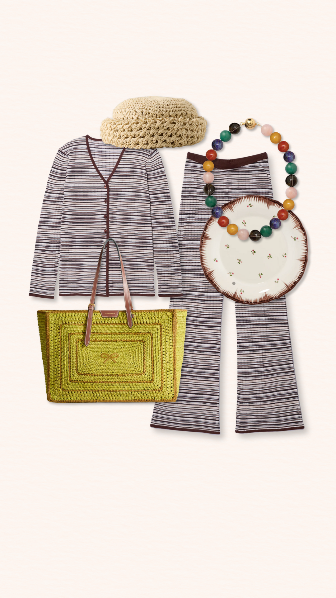 – Collage Quick Links: Hat / Cardigan / Pants / Necklace / Plate / Tote