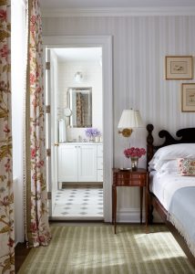 brooklyn-heights-brownstone-master-bedroom-McGrath-ii-english-country-house-style-striped-sanderson-wallpaper-swing-arm-sconces-bennison-fabric-floral-curtains